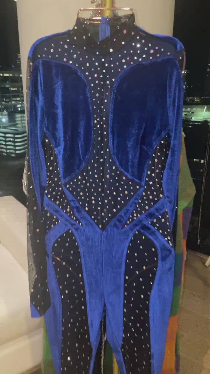 - Blue velvet sheer mesh rhinestone bodycon jumpsuit